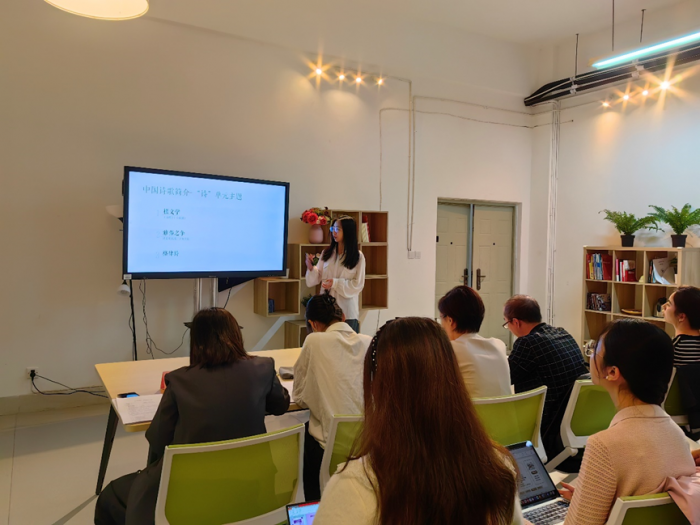 活动中,刘馨雨老师以“中国诗歌简介与鉴赏-格律诗”为主题,从 “根文学”“雅俗之争”和“格律诗”三个方面展开讲述,并聚焦“格律诗”部分,以焦点问题导入,以历时脉络兼以古今对比剖析格律诗的产生与特点。
