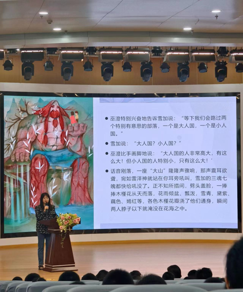 毛岸茜老师在会上以《山海经》、《荆楚岁时记》、《清嘉录》等古籍为切入点,分享自己的阅读体验,同时还带领同学们了解博大精深、底蕴丰厚的中国传统文化。不仅详细介绍了《山海经》里神奇的邦国、山川名物、植物、动物等,还以“时间的细节”为主题,清晰地讲解了二十四节气里种种民俗。最后向同学们讲述了《山海岁时即》的灵感来源和创作历程,鼓励大家积极阅读、积极写作。现场气氛热烈、掌声阵阵。