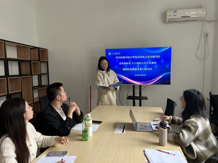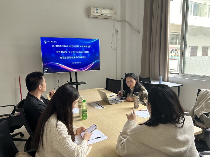 2024年10月24日,四川传媒学院中华优秀传统文化传播学院美育教研室成功召开了公共艺术课程师资队伍数据采集与研讨会。此次会议旨在通过深入的数据收集与分析,全面了解我校公共艺术课程师资队伍的现状,为进一步优化和提升美育教育教学质量提供有力支持。会议由美育教研室负责人赵丽云主持,美育教研室成员秦文涛、朱遥玲、戈心悦、邹关调等多位老师参加了此次会议。
