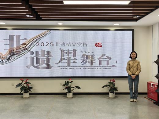3月15日下午14:30,中华优秀传统文化传播学院美育教研室戈心悦老师,参加了由成都市非物质文化遗产保护中心与成都市文化馆联合主办的2025年“非遗星舞台”非遗精品赏析活动。本次活动汇聚了众多非遗领域的专家与学者,共同为观众带来了一场精彩纷呈的非遗文化盛宴。