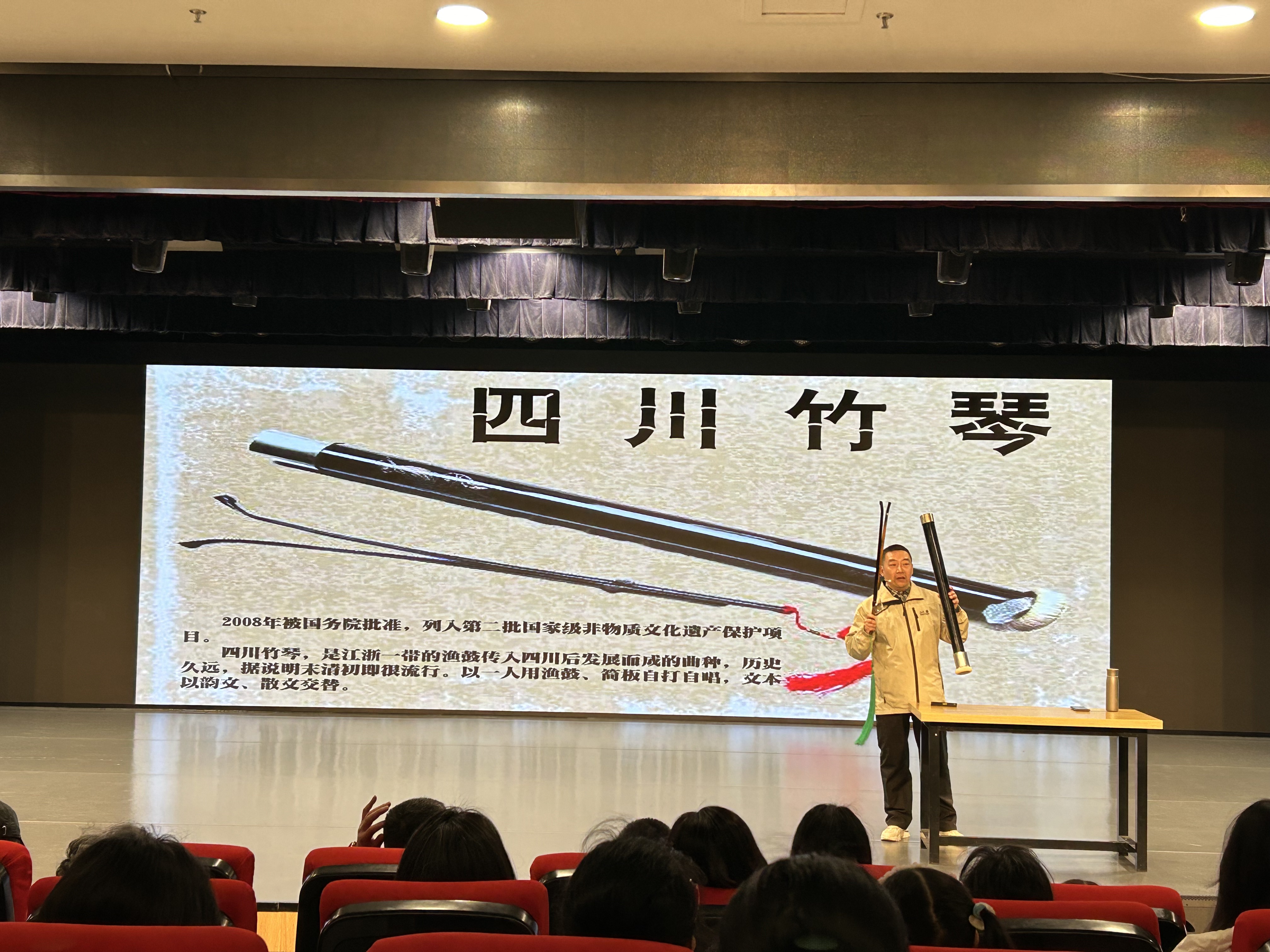 活动伊始,四川竹琴省级代表性传承人、金钱板传承人、二级演员谢赤非老师,为现场观众带来了关于四川竹琴的深入讲解。谢老师从四川竹琴的起源讲起,详细阐述了其独特的艺术流派、悠久的传承历史以及在新时代背景下的创新发展。他强调,四川竹琴作为非物质文化遗产的重要组成部分,不仅承载着丰富的历史文化信息,更是中华民族智慧与创造力的结晶。