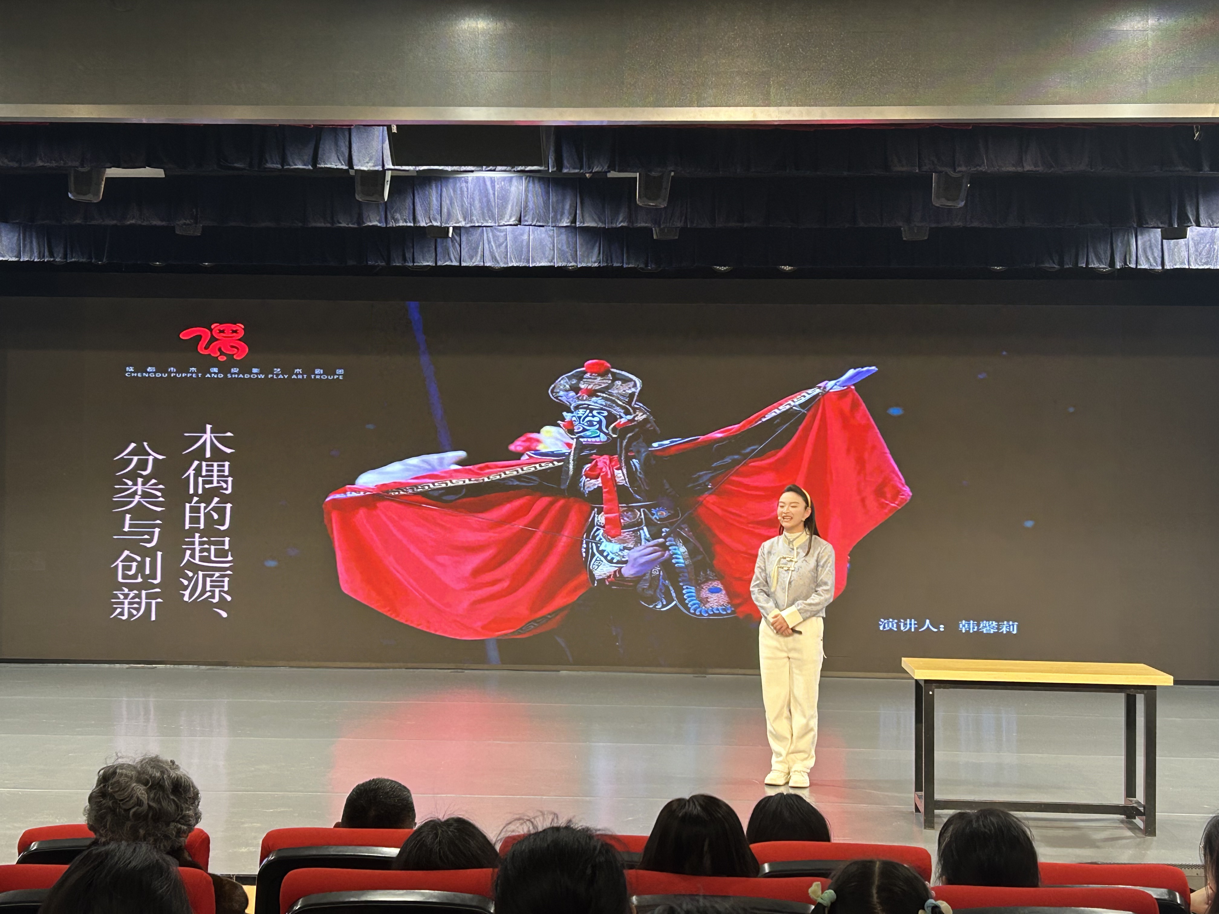 随后,成都市非遗保护中心木偶皮影剧团优秀青年演员、全国中青年木偶皮影大赛二等奖获得者韩馨莉老师,为大家带来了木偶艺术的精彩分享。韩老师详细介绍了木偶的起源、分类以及其在现代社会的创新应用。她通过生动的讲解和精彩的表演,让观众深刻感受到了木偶艺术的独特魅力和无限可能。
