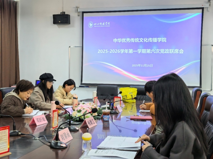 2025年11月25日下午14:00,四川传媒学院中华优秀传统文化传播学院在1A02-208会议室组织召开2025-2026学年第一学期第六次党政联席会议。会议由学院党政领导班子全体成员共同参加,重点围绕近期学院安全稳定工作与专业建设发展两大主题进行工作部署与推进。